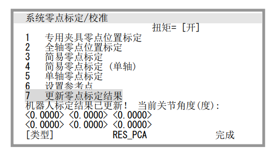 7. 選擇“7 更新零點標定結果”,按下 F4 “是”。進行位置調整。或者重新接通電源,同樣也進行位置調整。