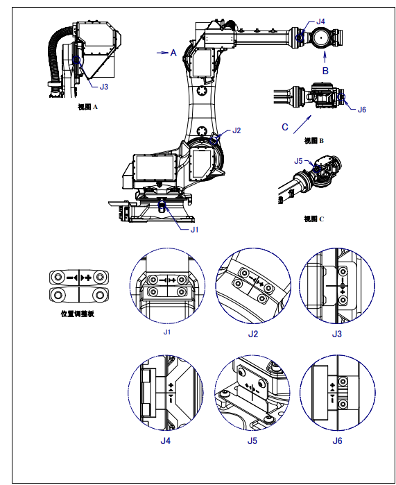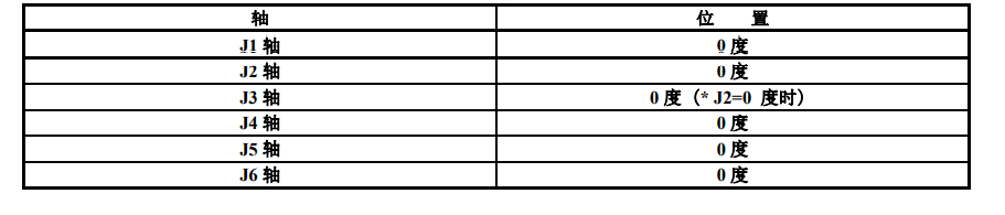 全軸零點位置標定(對合標記零點標定)是在所有軸零度位置進行的零點標定。機器人的各軸,都賦予零位標記(對合標記)。通過這一標記,將機器人移動到所有軸零度位置后進行零點標定。
